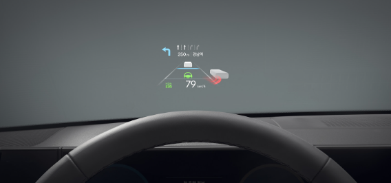 주행 중 주요 정보를 앞유리에 투영하여 운전자가 시선을 도로에서 벗어나지 않고도 속도, 내비게이션 경로, 주행 보조 상태 등을 확인할 수 있습니다.