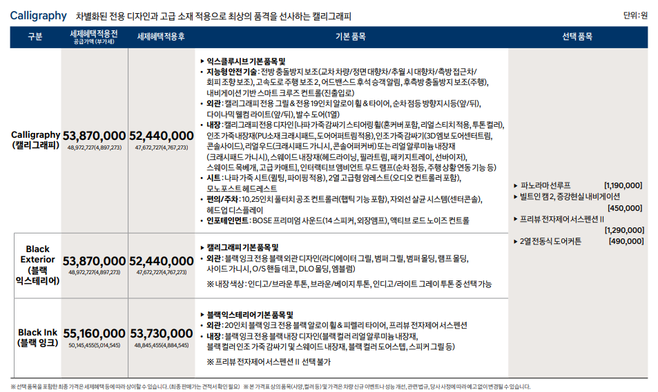 캘리그래피 53,870,000 52,440,000 최고급 소재와 고급형 편의 사양 추가
